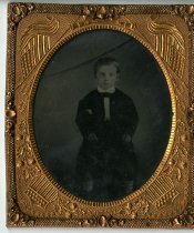 A group of twenty-four photographs documenting four generations of the Tichenor, Langsford, and Young families of Kentucky. Included in the collection are two loose ambrotypes of James Louis Young and Ann Maria Langsford, both stored separately with the ambrotype collection. Lewis C. Langsford married Lydia Ann Tichenor in Bardstown, Kentucky, on 8 June 1837. They had three children: Ann Maria Langsford, James Harvey Langsford, and Sarah Catherine Langsford. When Lewis died in 1841, Lydia stayed in Spencer County, with her deaf daughter Ann living with her. Ann died in 1907 of acute gastro-enterocolitis. Sarah Catherine "Kate" Langsford married John Eastburn Young in Spencer County in 1857. John worked as a carpenter until his death. Records indicate they moved to Louisville sometime between 1880 and 1894 and lived at 1804 Floyd St. John died in 1894 of tuberculosis or other phthisis disease, and Kate died in 1917 from "shock from broken hip." John and Kate had 8 children together, one being Charles Roy Young. Charles married Elizabeth "Bess" Nicholls in 1902 in Louisville. In 1920 and 1930, he worked as a Chief Clerk for the Tariff Bureau. Charles and Bess had one son, John "Jack" Nicholls Young. Charles was a clerk for the Louisville & Nashville Railroad at the time of his death in 1936. Jack worked for the Consolidated Biscuit Company, as a truck driver, and as a guilder in an antique shop. He was a corporal in the U. S. Army during WWII. John and Kate also had a daughter, Annie. Annie was a schoolteacher in Louisville from at least 1900 to 1920. By 1940, she was 82 years old and living with a niece in Long Beach, CA. In one of the photos, she is seen behind the Young house (either 1804 or 1140 Floyd St.) with her sister-in-law, Nancy Proctor Young. John and Kate's other son, James Lewis Young, (note: his name is spelled as both Louis and Lewis in records), was born in Taylorsville in 1860. He married Elizabeth Morgan Collier in Spencer County in 1891. James worked as a carpenter under his father in Taylorsville and then as a building contractor in Louisville. He and Elizabeth had 3 children, but only James Lewis Young, Jr., survived to adulthood. Their daughter Elizabeth Loraine Young died as an infant in 1900. James, or Lewis, Jr., worked as a clerk for the L&NRR until the family moved to Atlanta, where he worked as an assistant executive clerk. He was a sergeant for the US Army during WWI. John and Kate's son, Harvey Milton Young, was born in Taylorsville, but moved to Chicago sometime before 1900. He was married to Nancy Proctor Young. In Chicago, he worked as an undertaker, before moving to Dayton, Ohio. From 1910 on, he worked as a salesman of screens. They had a daughter, Katheryn. Katheryn was born in Chicago and lived in Ohio. She was a Stenographer for the screen company her father worked at. She also worked as a telephone operator. She married Ralph Payne Salisbury and together they had a son, Robert "Bobby" Milton Salisbury. Irving Tichenor was the son of Charles Tichenor and Kate Thixton. He was born in Nelson County where he worked as a farmer and later a physician. He was married to Mary "Mamie" K. Powers in Spencer County in 1902, and together they had four children. Images scanned include: 023PC31.01: Lydia Ann Tichenor 023PC31.03: Annie M. Langsford 023PC31.05: Charles Roy Young 023PC31.07: Charles Roy Young with his wife, Bessie, and son, Jack. 023PC31.08: Jack N. Young 023PC31.09: Annie M. Young with her sister-in-law, Nancy Proctor Young, behind their home on Floyd St. in Louisville. Either 1804 or 1140 Floyd St. 023PC31.11: Mary Kay Young and James Louis Young. 023PC31.13: James Louis Young. 023PC31.14: Elizabeth Morgan Collier, the wife of James Louis Young. 023PC31.17: Harvey M. Young and James "Lewis" Young, Jr. 023PC31.19: Nancy Proctor Young with her daughter, Katherine. 023PC31.21: Katherine Young Salisbury and her son, Bobby. 023PC31.23: Family photo including Katherine Young Salisbury, Bess Nichols Young, Jack Young, and unidentified others. 023PC31.25: Ambrotype of Ann Maria Langsford, ca. 1854. 023PC31.26: Ambrotype of James Louis Young at age 5, taken in 1865. |